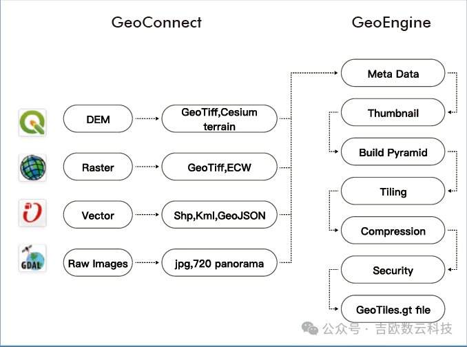 GeoTiles格式是Geotwin创新的空间数据存储和发布格式,支持多源数据融合,提供多种安全保密机制,并支持更高的数据压缩和性能优化技术。